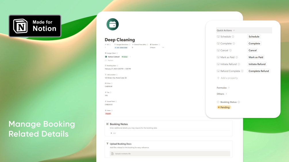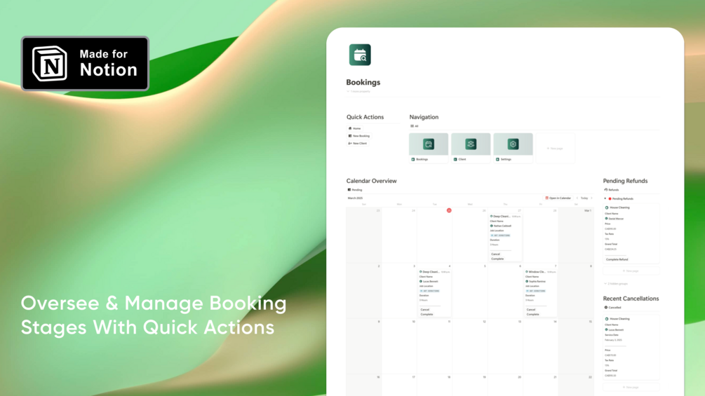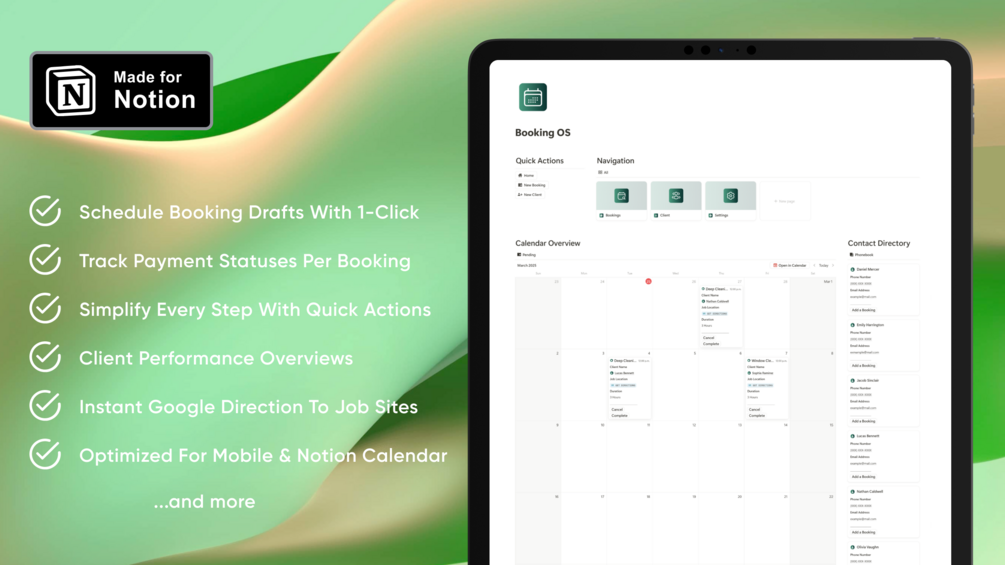 Streamline your service-based business with Booking OS – a comprehensive Notion template designed to manage bookings, customer performances, and scheduling in one central hub. Whether you're running a cleaning business, landscaping service, or any other service-oriented business, this template will help you stay organized, efficient, and in control.